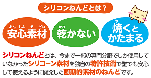 シリコン粘土(シリコーンねんど)とは、安心安全に素材で・やわらかい、乾かない・焼くとかたまるという不思議な感覚。