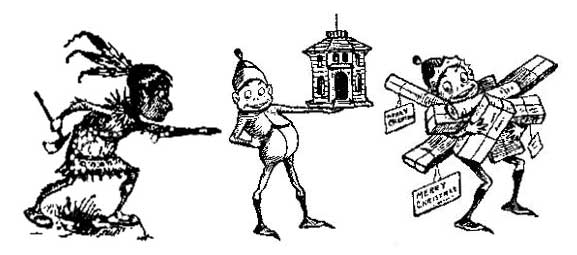 パーマー・コックス 《3人のブラウニーセット1・クリスマス》 画像の左から順に、インディアン、ドールハウスとブラウニー(クリスマス)、沢山のクリスマスプレゼントとブラウニー(クリスマス)。